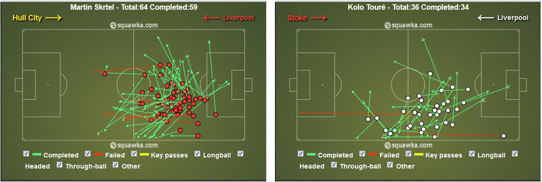 The difficulties associated with passing from the back translate to a right footed centre back playing on the left, albeit to a lesser degree. Passing across the pitch can prove to be dangerous, yet Martin Skrtel completed a disproportionate amount of passes at Hull City towards the right flank, as he naturally would. It must be noted that is was not as harmful as the poor defending that day. On the other hand, Kolo Toure also looked uncomfortable playing on the left at Stoke, at least with the ball. He didn’t show too much confidence in Aly Cissokho at times; and on other occasions, the lack of options in midfield resulted in him deciding to pass backwards to Simon Mignolet. The additional time (however little) taken to use his stronger foot to pass coupled Stoke City’s pressing high up the pitch put Mignolet under pressure on more than one occasion – including the lead-up to Charlie Adam’s equalizer.