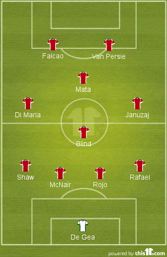 Probable Lineup (4-4-2 (diamond)): De Gea; Shaw, McNair, Rojo, Rafael; Blind; Di Maria, Mata, Januzaj; Falcao, Van Persie