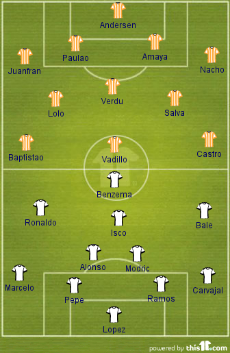 Expected line-up (4-3-3): Andersen; Juanfran, Paulao, Amaya, Nacho; Verdu, Lolo, Salva; Baptistao, Vadillo, Castro;