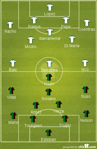 Probable Line-Up (4-3-3): Lopez; Nacho, Ramos, Pepe, Coentrao; Modric, Illarramendi, Di Maria; Bale, Benzema, Isco;