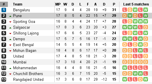 The match in Shillong, Megahlaya was classic example why you call this season as most unpredictable season. Bengaluru FC were clear favourite to get full three points against rock bottom club Rangdjiad United FC. Rangdijiad United under their new coach Herring Shangpliang urprised Bengaluru FC 3-2. Steven Dias, Lalnunpuia and Ranti Martins scored for the host while Chettri and Rooney scored for Bengaluru FC. This defeat will be a wake up call for Bengaluru FC that winning the league would not be easy.