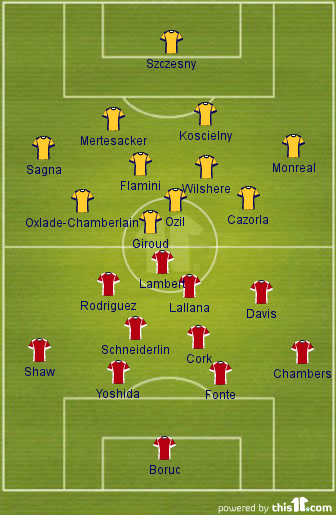 Possible Starting Lineup [4-2-3-1]:Ai??Boruc, Chambers, Fonte, Yoshida, Shaw, Schneiderlin, Cork, Davis,Ai??Rodriguez (CAM), Lallana (LAM),Ai??Lambert (CF)