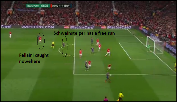 The Brazilian picked out Mandzukic to perfection who headed the ball back to the unmarked Schweinsteiger, the German who slotted home from close range. It was more of Fellainiai??i??s (who was ball watching, as the above snap shows) indiscipline rather than Unitedai??i??s collective failure.