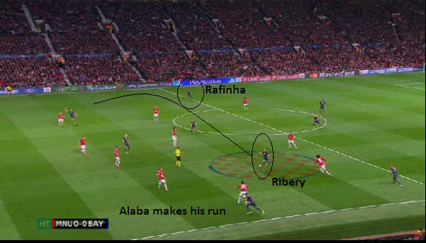 Below Snap: Alabaai??i??s run from the deep takes Valencia away and as Lahm drifts in the centre, its suddenly a 3 vs 2 in the middle of the park. Ribery easily switches play to Rafinha, the right back who is in acres of space.