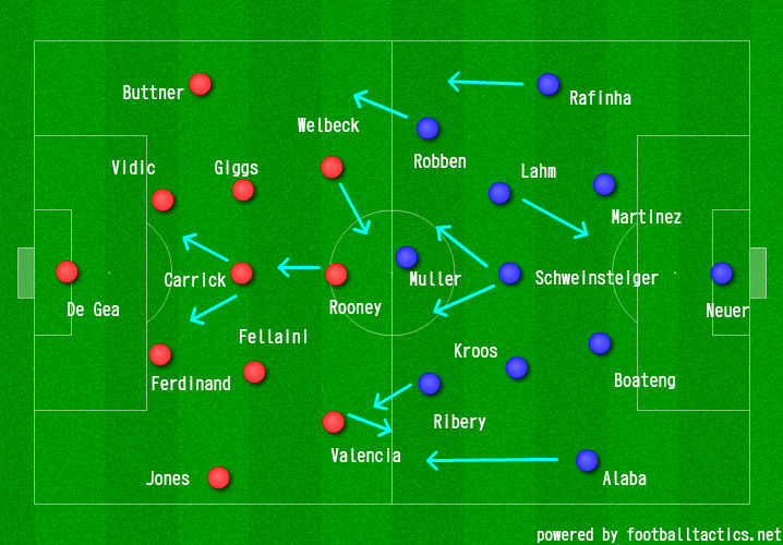It was surprising to see Micheal Carrick being paired in the middle alongside Ryan Giggs and Marounne Fellaini, while Phil Jones started at right back thanks to Rafaelai??i??s injury. Alexander Buttner had the grandest of stages to shine at the left back position thanks to Patrice Evraai??i??s suspension. Wayne Rooney played in the number ten role as I had said in my pre match analysis while Danny Welbeckai??i??s pace was instrumental to Moyesai??i?? plans on the night. For the Bavarians, Javi Martinez was deputed at centre back thanks to Danteai??i??s suspension while Toni Kroos and Phillip Lahm assisted Bastian Schweinsteiger in the midfield. Completing the 4-3-3 setup was the triumvirate of Robben, Ribery and Thomas Muller.