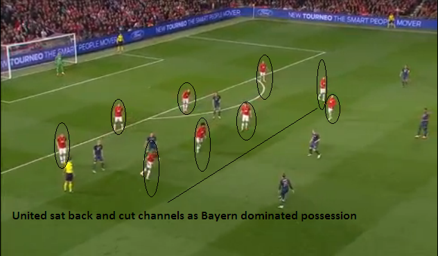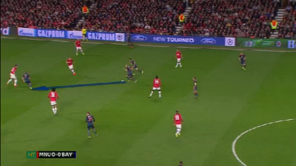 Unitedai??i??s lineup was a mix of the old fashioned 4-4-2 British system with the overloading 4-5-1 setup. The home side sat back and their strategy was crystal clear from the first whistle: Get the ball, move it forward as quickly as possible. Catch Bayern off guard and take advantage of the spaces left behind (snap below).