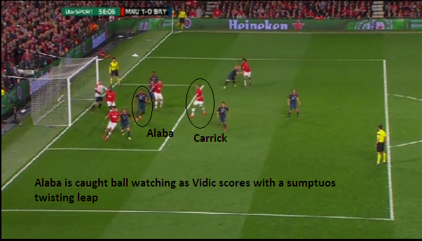 Vidic should have never been given the time and space but unfortunately for the Bavarians, David Alaba is caught dreaming.