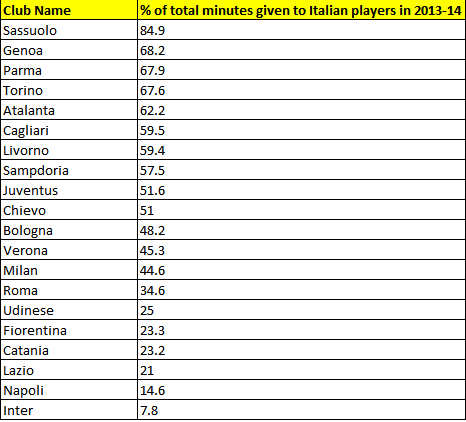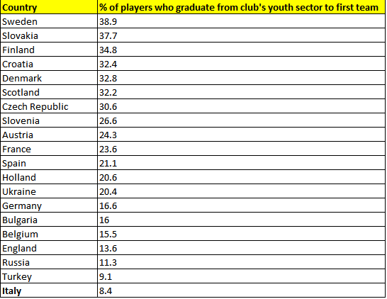 Italyai??i??s failure on the world stage is nothing but an extension of these problems at the domestic level. Year after year, the rate of Italians in the squads are decreasing while the number of foreigners are increasing. In 2012 Inter played Ajax in final of the NextGen. Today, Ajax has 7 players from that team in their squad. Inter? 0. Average expenditure on youth sectors per club: Italy (2.75m) – Germany (4.4m). Total: Italy (55m) – Germany (79.3m). Current clubs in Serie A who have players in their squad who have been promoted from the youth sector : Atalanta (8), Roma (4), Juventus (3), Fiorentina (2), Inter and Lazio 1 each.