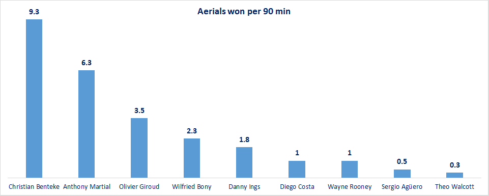 Christian Benteke has had the highest number of aerial wins a almost 50% more than the next highest (Anthony Martial) and almost 200% more than the subsequent highest (Olivier Giroud). Liverpool should definitely play on the wings with more crosses to the tall flying giant.