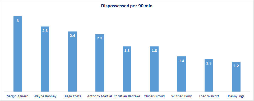 There are certain strikers who cannot be easily dispossessed. This makes the opponentsa job very difficult. Danny Ings, Theo Walcott and Wilfried Bony are the ones who were these special players who have not been dispossessed very often.