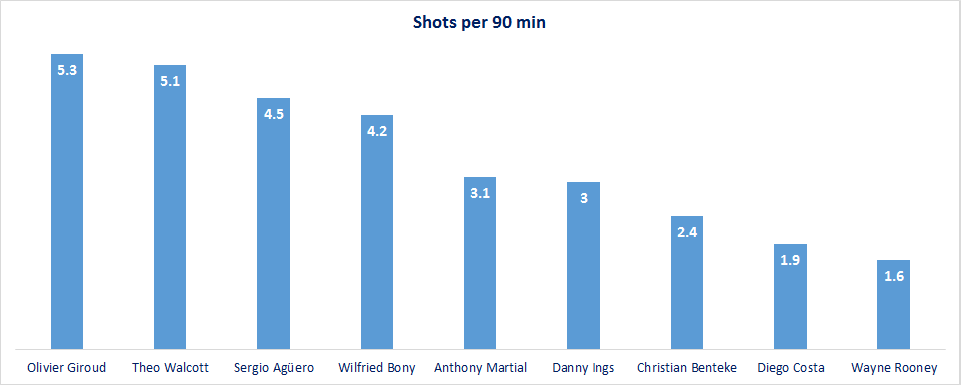 Arsenal and Manchester City strikers have had the highest shots, but City strikers can boast of a more successful conversion rate.