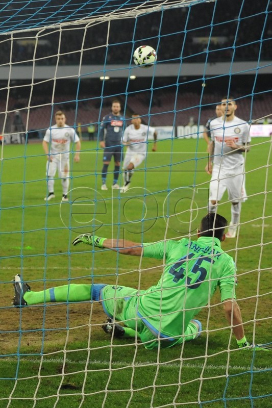 Mancini fielded the 4-3-1-2 with Santon and Da Ambrosio on either side of Ranocchia and Juan Jesus. The Guarin-Medel-Brozovic midfield remained intact with Shaqiri in the trequartista role behind Palacio and Icardi. Juan Jesus was rather harshly booked for holding back Gonzalo Higuain within 25 seconds which meant the Brazilian would miss the next match. Higuan made space for himself on the edge of the box but his curler was fingertipped out from under the bar by Samir Handanovic in a very aggressive Napoli start. Fredy Guarin tried to take advantage of the windy conditions with a lob just over the bar from midfield. Higuaina s angled drive was wide, then he was sent clear on goal by Hamsik and tried to chip Handanovic, but the goalkeeper stayed on his feet and got fingertips to it. Marcelo Brozovic fired over for Inter a few minutes later, but Higuain incredibly fluffed a glorious chance to score on 31 minutes. Mertens whipped in a perfect cross, but the Argentine shinned it over an open goal from six yards. After a catalogue of errors in the Inter defence, Higuain eventually stung Handanovica s fists at the near post. Then, just before the break Xherdan Shaqiri went on a mazy run and fired at goal but it was straight at Mariano Andujar. There were no goals in a frantic first half but they began to flow after half-time as Marek Hamsik and Gonzalo Higuain boosted Napoli into a two-goal lead.