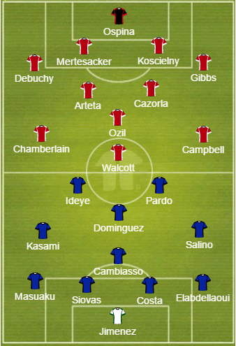 Expected line-up (4-2-3-1): Ospina; Debuchy, Mertesacker, Koscielny, Gibbs; Arteta, Cazorla, Ozil; Chamberlain, Campbell, Walcott