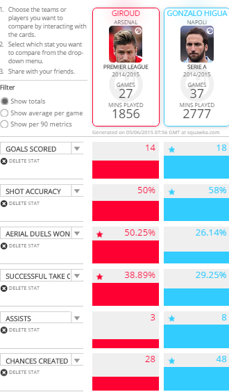 Known for his goalscoring prowess, Higuain has notched up a total of 18 goals at 0.58 per 90 minutes in comparison to Giroud who has scored 14 goals despite a season interrupted by injuries at 0.68 per 90 minutes for Arsenal FC. The superior per 90 minute statistic coming in a much superior league for Giroud with all due respect to Italian Serie A.