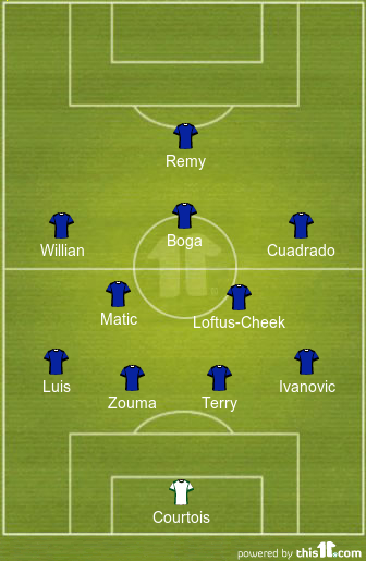 Possible lineup (4-2-3-1): Courtois (GK), Luis, Terry, Zouma, Ivanovic; Matic, Loftus-Cheek; Willian, Boga, Cuadrado; Remy