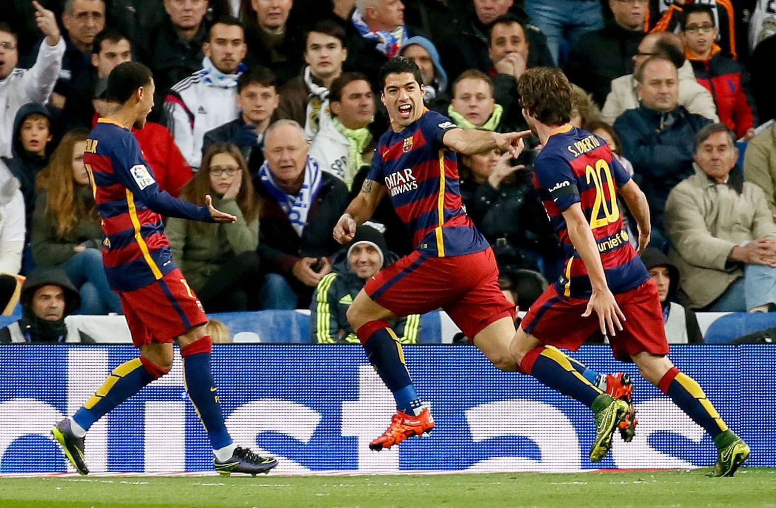 Luis Suarez and Neymar continued their sensational goalscoring form as Barcelona moved six points clear of Real Madrid at the top of La Liga with a 4-0 thrashing of their bitter rivals at the Bernabeu on Saturday.