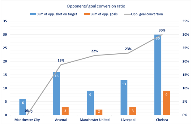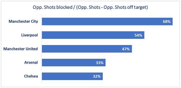 Defense is responsible to block opponenta s efforts to safeguard goalkeeper. But Chelsea and Arsenal defenders forgot it and left the goalkeepers to fight for their glory alone. Unfortunately, Arsenal could not play their main center backs Per Mertesacker and Laurent Koscielny. But Chelseaa s mistakes are unforgivable. Their defense have exposed Courtois and Begovic so much than any other big 5 team. Citya s defensive wall Vincent Kompany and Mangala have proved their worth by blocking 68% of the shots that came towards goal.
