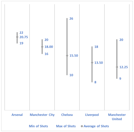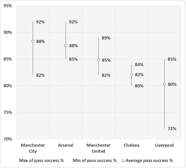 The usual story is Arsenal’s perfect passing game. Manchester City though has not been as consistent as Arsenal, managed to better them on average. Chelsea is the most consistent (though below average) with variance as little as 4% in their passing accuracy. Liverpoola s passing accuracy wilderness shows that they will play more direct games rather than try to control them.
