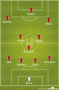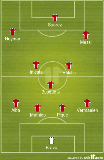Probable Starting XI (4-3-3): Bravo; Mathieu, Pique, Vermaelen, Alba; Rakitic, Iniesta, Busquets; Neymar, Messi, Suarez.