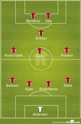 Predicted Line Up: Andersen; Boliesen, Kjaer, Sviatchenko, Wass; Krohn-Dehli, Kvist, Poulsen; Eriksen; Bendtner, Vibe