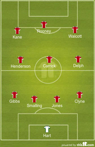 Expected Line Up: Hart, Clyne, Smalling, Jones, Gibbs, Henderson, Carrick, Delph, Walcott, Kane, Rooney.