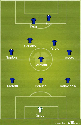 Predicted Line Up: Sirigu; Ranocchia, Bonucci, Moretti; Abate, Verratti, Santon, Soriano, Parolo; Pelle, Eder