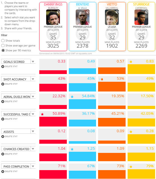 Known for being quick and playing on the shoulders of the last defender, Ings is good on the ball, too, with a 50.89% rate of successfully taking on players. That is impressive given how good Sturridge appeared on the ball last season for Liverpool FC. Vietto labeled the ‘next Aguero’ is behind him in that attribute.