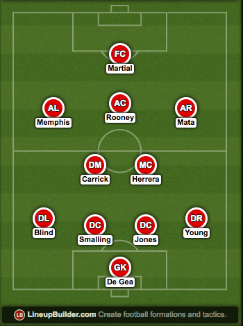 Probable lineup (4-2-3-1): De Gea(GK), Blind, Smalling, Jones, Young; Herrera, Carrick; Depay, Rooney, Mata; Martial