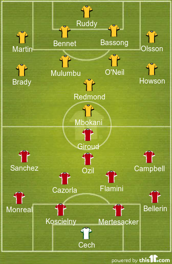 With the exception of Jarvis, Alex Neil has the whole squad to choose from. John Ruddy will be the chosen shot stopper for the weekend, with a back four of Bassong and Bennet at the center, whilst Olsson plays on the right and Martin on the left. Olsson will have to be on his toes as he will go head to head against Arsenala s best outfield players at the moment. With Sanchez posing an aerial treat as well, Bassong and Bennet will have to stay alert as Sanchez as well as Giroud will look to get behind them to latch onto Ozila s lofted passes.