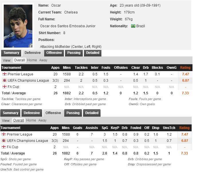 A vital cog in Mourninhoa s Chelsea machine, Oscar dos Santos Emboaba JA?nior can look at his career so far and call it a success. However, like all young careers with huge expectations, Oscar knows that to be established as one of the all-time greats, he needs to win trophies. And to do that, he needs to perform consistently at the top level and at a top club. If he does in fact stay at Chelsea (he signed a long-term deal this season) for the duration of his contract, there is no doubt in any Bluesa faithful minds that he will go on to become a success. If, however, he does wish to emulate his idol Ricardo Kaka, he still has a long way to go.