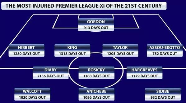 The picture of the most injured XI of the 21st century as well as Arsenal FC’s own XI of most injured players can be seen below: