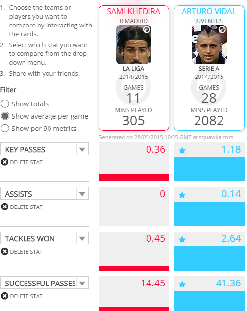 Statistics reveal that Arturo Vidal had a much better season than Khedira, however, considering that Khedira did not feature in the starting lineup regularly, the stats are bit out of context.