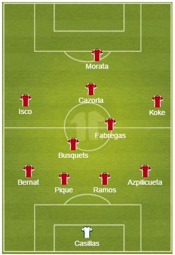 Predicted XI (4-2-3-1): Casillas; Bernat, Pique, Ramos, Azpilicueta; Busquets, Cazorla; Isco, Fabregas, Koke; Morata