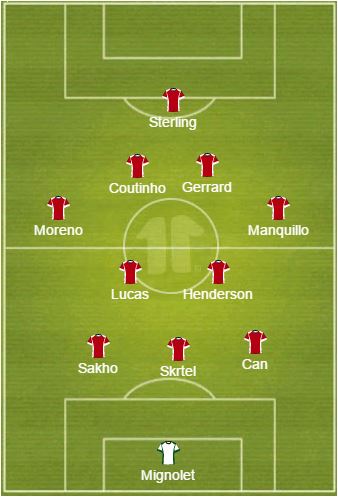 Predicted Starting XI: Mignolet, Can, Skrtel, Sakho, Manquillo, Henderson, Lucas, Moreno, Gerrard, Coutinho, Sterling