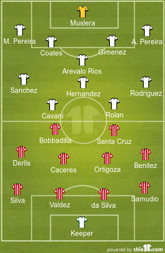 Possible lineup (4-1-3-2): Muslera, M. Pereira, Coates, Gimenez, A. Pereira; Arevalo Rios; Sanchez, Hernandez, Rodriguez; Cavani, Rolan