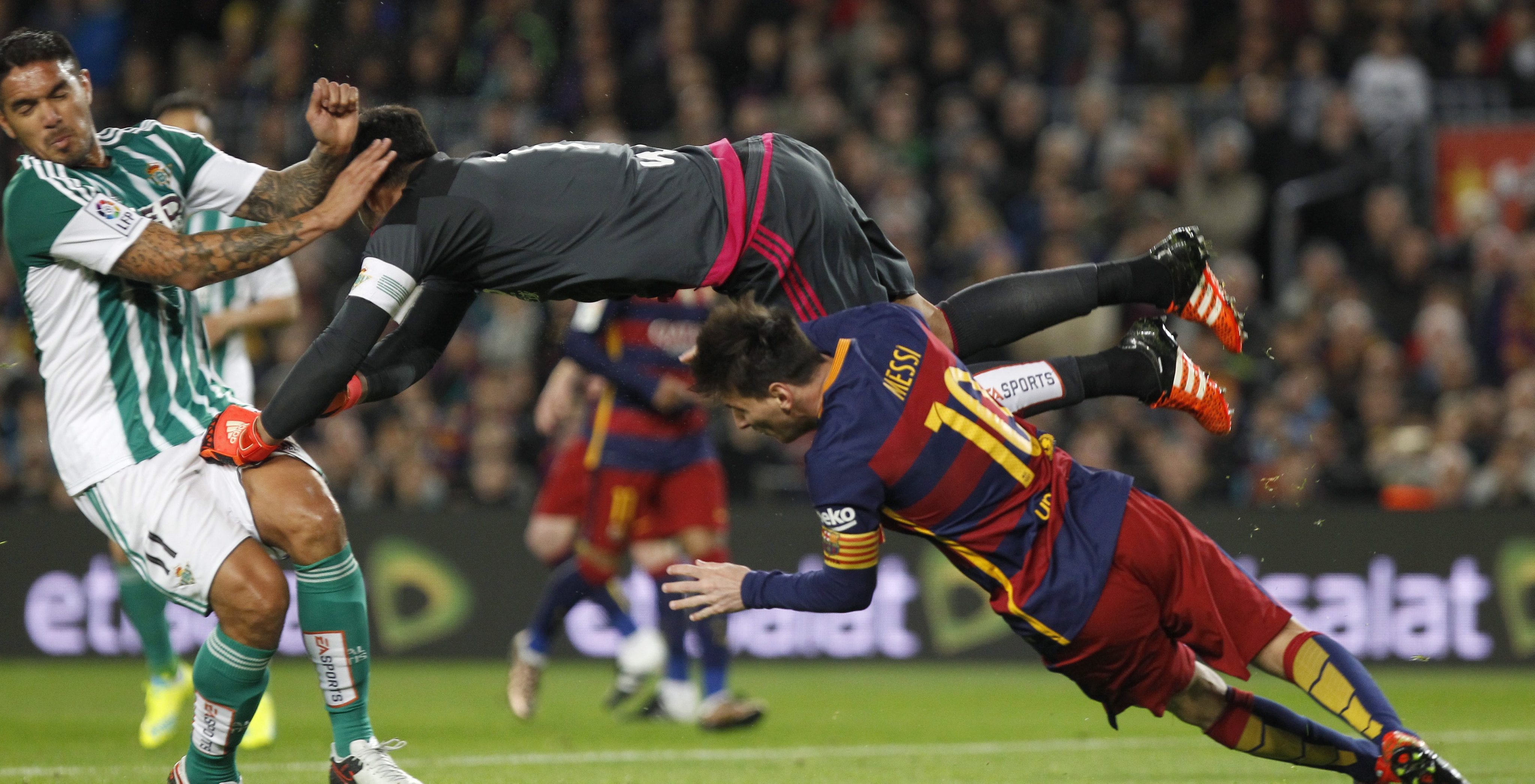 FC Barcelona midfielder Sergio Busquets played a ball over the top of the Betis defence in search of Messi, which prompted keeper Antonio AdA?n to leave his line and punch the ball clear. Despite very clearly getting all of the ball and none of Messi, the referee pointed to the spot.