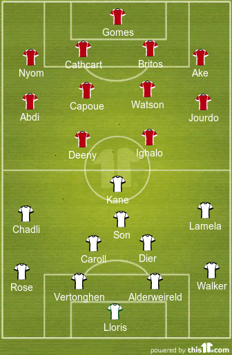 Predicted Line-up (4-4-2): Gomes; Ake, Britos, Cathcart, Nyom; Juardo, Watson, Capoue, Abdi; Deeny, Ighalo;