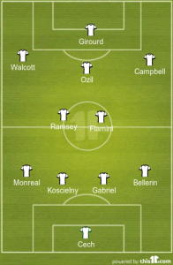 With Arsenal’s midfield woes, it should fall to Flamini to screen the defence with Ramsey alongside him. Walcott, Ozil and Joel Campbell should be the main thrusts of Arsenal’s attacking play with Giroud as the elegant, decisive focus.