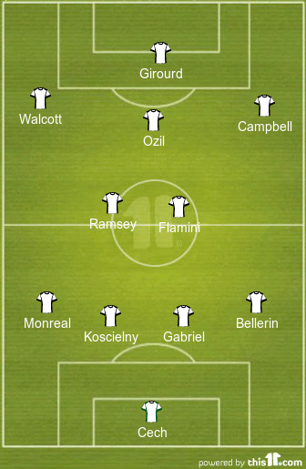 Probable Starting XI (4-5-1): Cech; Bellerin, Gabriel, Koscielny, Monreal; Flamini, Ramsey, Ozil, Walcott, Campbell; Girourd.