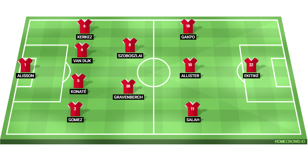 Probable Lineup (4-2-3-1): Alisson; Gomez, Konate, van Dijk, Kerkez; Gravenberch, Szoboszlai; Salah, Mac Allister, Gakpo; Ekitike