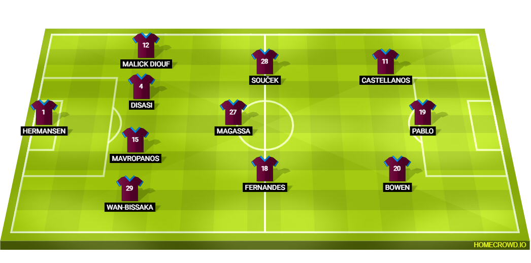 Probable Lineup (4-3-3): Hermansen; Wan-Bissaka, Mavropanos, Disasi, Diouf; Fernandes, Magassa, Soucek; Bowen, Pablo, Castellanos