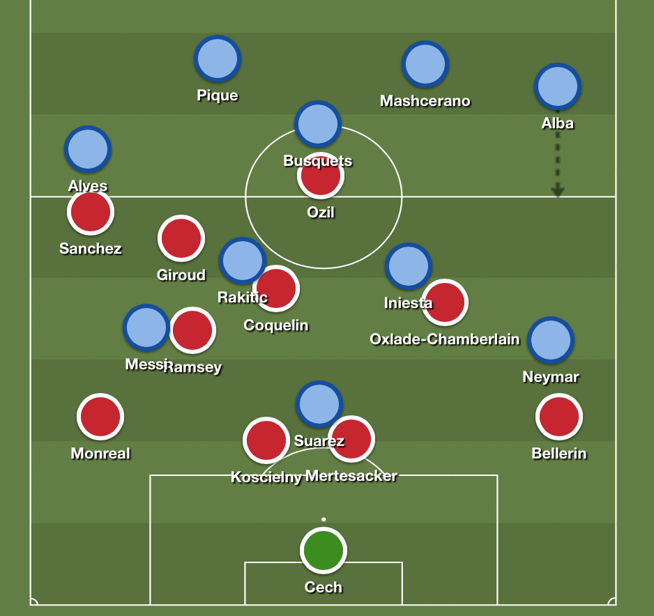 Instead of employing any form of aggressive pressing, the Gunners positioned themselves to cover the Blaugrana’s midfield creators — mainly Iniesta and Rakitic — and closely shadowed Messi, Suarez and Neymar. They were perfectly happy allowing Busquets to drop back along with the centre-backs to get the ball. The idea here was to never allow Barca to have an extra man in midfield and especially the final third. Although it is (and was) very difficult to maintain the shape throughout the 90 minutes, Arsenal went about their job brilliantly, especially in the first half. Arsenal’s defensive transition from one side of the field to the other when Barca switched play was also commendably disciplined.