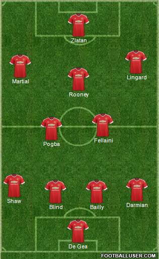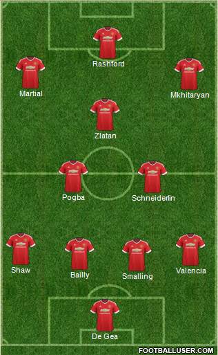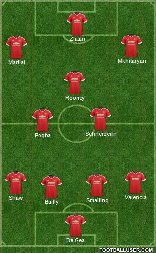 The iconic Zlatan Ibrahimovic will lead the line ahead of Wayne Rooney in a deeper role, with the prodigious French wonderkid Anthony Martial on the left wing and Bundesliga Player of the season Henrikh Mkhitartan on the right. Paul Pogba obviously gets into central midfield, alongside his compatriot and the more defense oriented Morgan Schneiderlin.