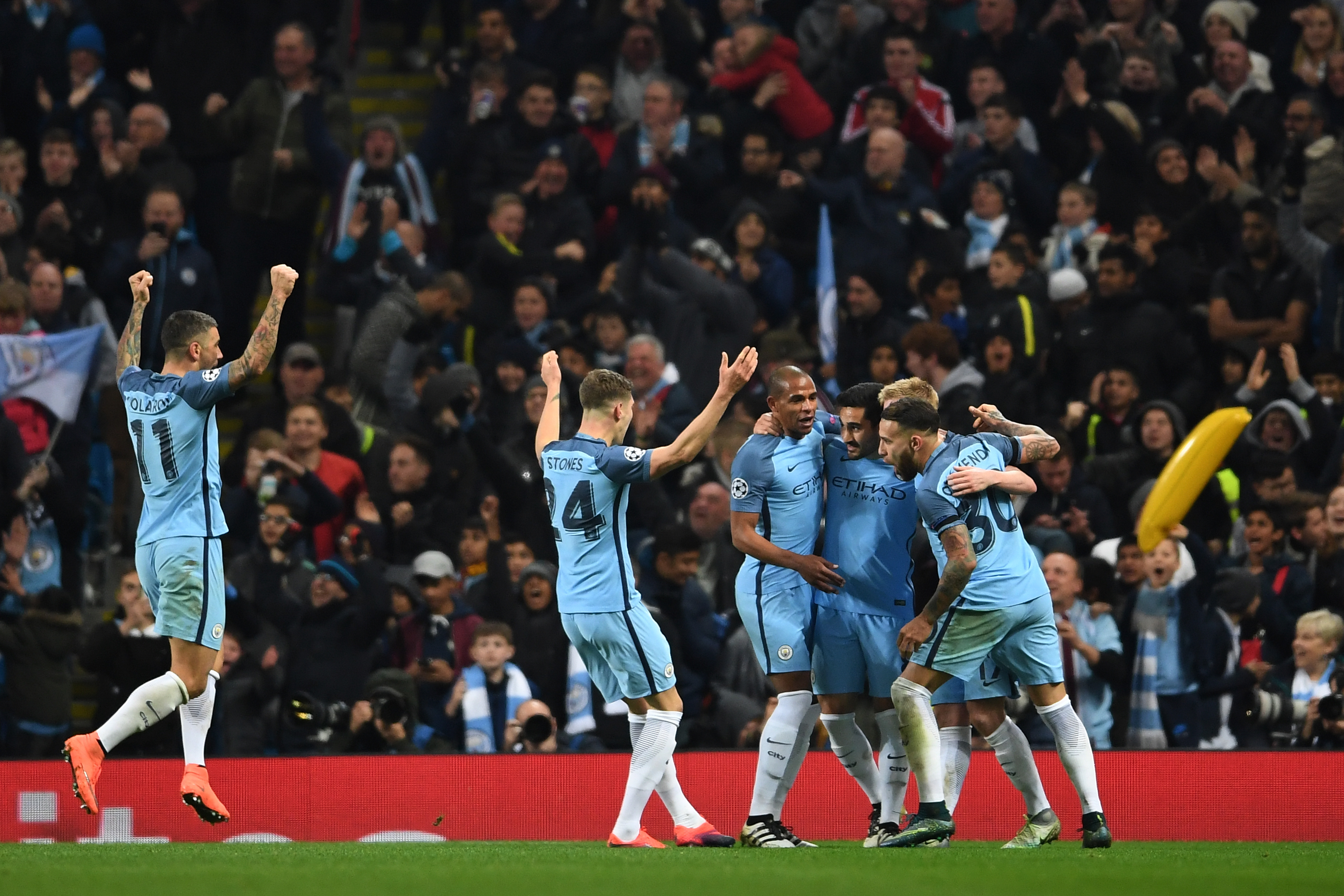 MANCHESTER, ENGLAND – NOVEMBER 01: Manchester City players celebrate victory after the UEFA Champions League Group C match between Manchester City FC and FC Barcelona at Etihad Stadium on November 1, 2016 in Manchester, England. (Photo courtesy – Shaun Botterill/Getty Images)
