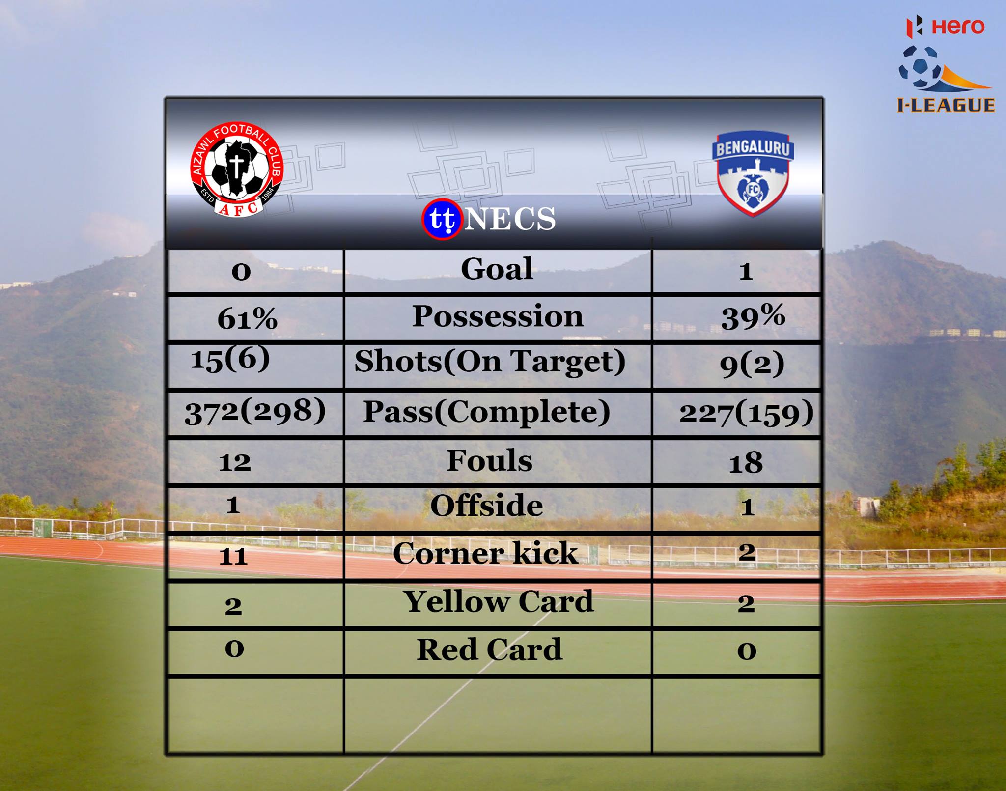 Aizawl FC played free flowing football as was the case in the second half against Mohun Bagan and had 14 corners as compared to 1 earned by Bengaluru FC. Aizawl enjoyed the lion’s share of the possession and had more shots on target but were denied by some fine goalkeeping from Bengaluru custodian Thuammawia.