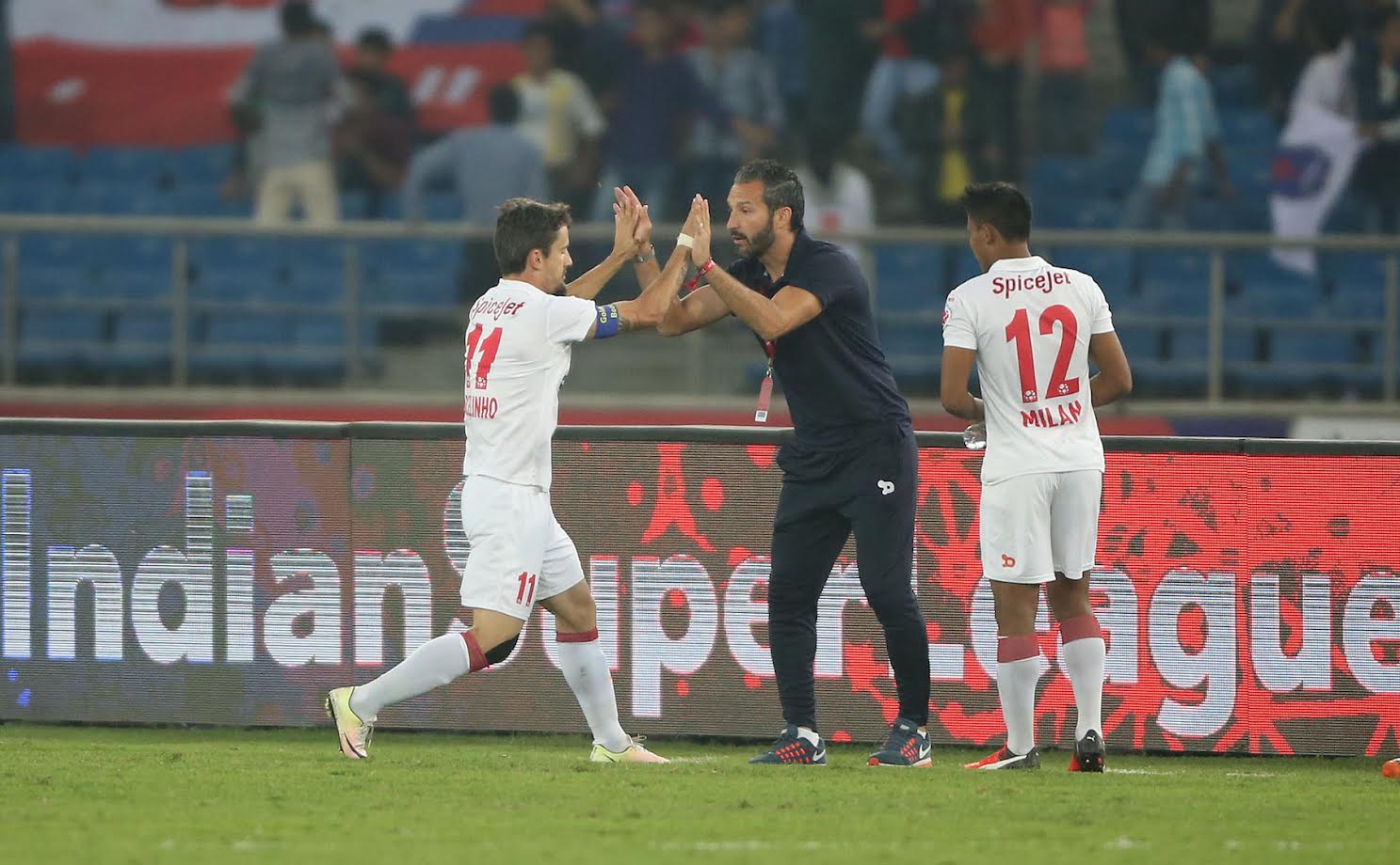 Brazilian striker Marcelinho Pereira scored a magnificent hat-trick with goals in the 38th, 48th and 56th minute while Richard Gadze scored the other two goals to help Delhi Dynamos inch closer to a place in the semifinals. Delhi have now moved to the second spot with 20 points from 12 matches. Delhi, however, are not yet guaranteed of a semi-final spot as yet as three other teams (Kerala Blasters, Atletico de Kolkata and NorthEast United) can all overtake their points tally if results go their way. Delhi requires two point from their last two matches to stand a chance of qualification to play-offs.