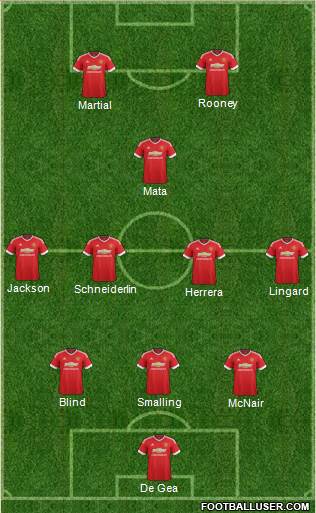 Probable Starting XI (3-4-1-2): De Gea; Blind, Smalling, McNair; Bothwick-Jackson, Schneiderlin, Herrera, Lingard; Mata; Martial, Rooney.