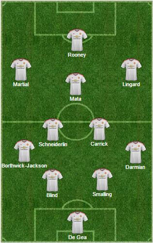 #mufc XI: De Gea, Darmian, Smalling, Blind, Borthwick-Jackson, Schneiderlin, Carrick, Lingard, Mata, Martial, Rooney pic.twitter.com/ukmWfoNeOH