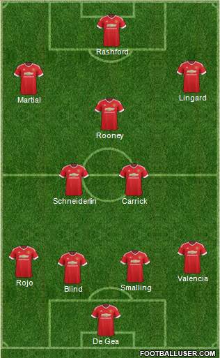 Van Gaal is expected to start with a largely first choice attack and midfield, consisting of Marcus Rashford, Anthony Martial and Jesse Lingard up front, Wayne Rooney, Michael Carrick and Morgan Schneiderlin in midfield. With the two first-choice full backs Luke Shaw and Matteo Darmian unavailable, Marcos Rojo and Antonio Valencia line up alongside Chris Smalling and Daley Blind in defence. The inspirational David de Gea also takes up his position between the posts.
