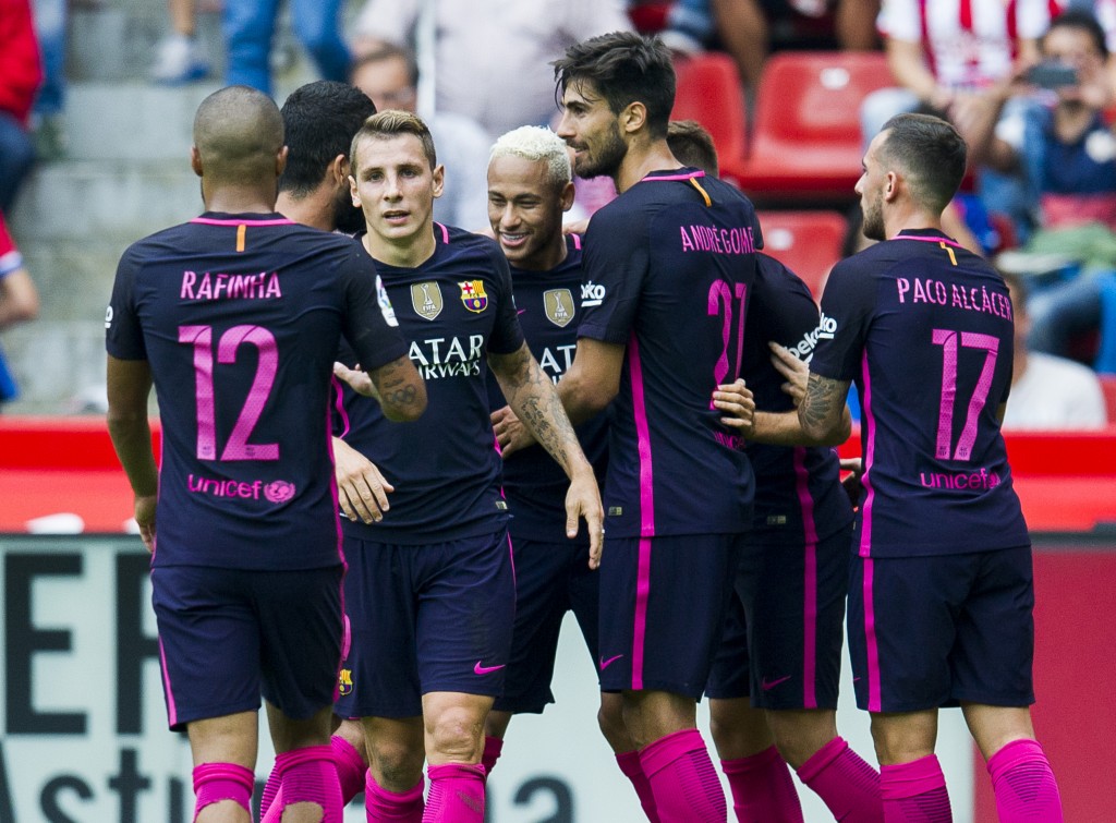GIJON, SPAIN - SEPTEMBER 24: Neymar of FC Barcelona celebrates after scoring his team's fifth goal during the La Liga match between Real Sporting de Gijon and FC Barcelona at Estadio El Molinon on September 24, 2016 in Gijon, Spain. (Photo by Juan Manuel Serrano Arce/Getty Images)
